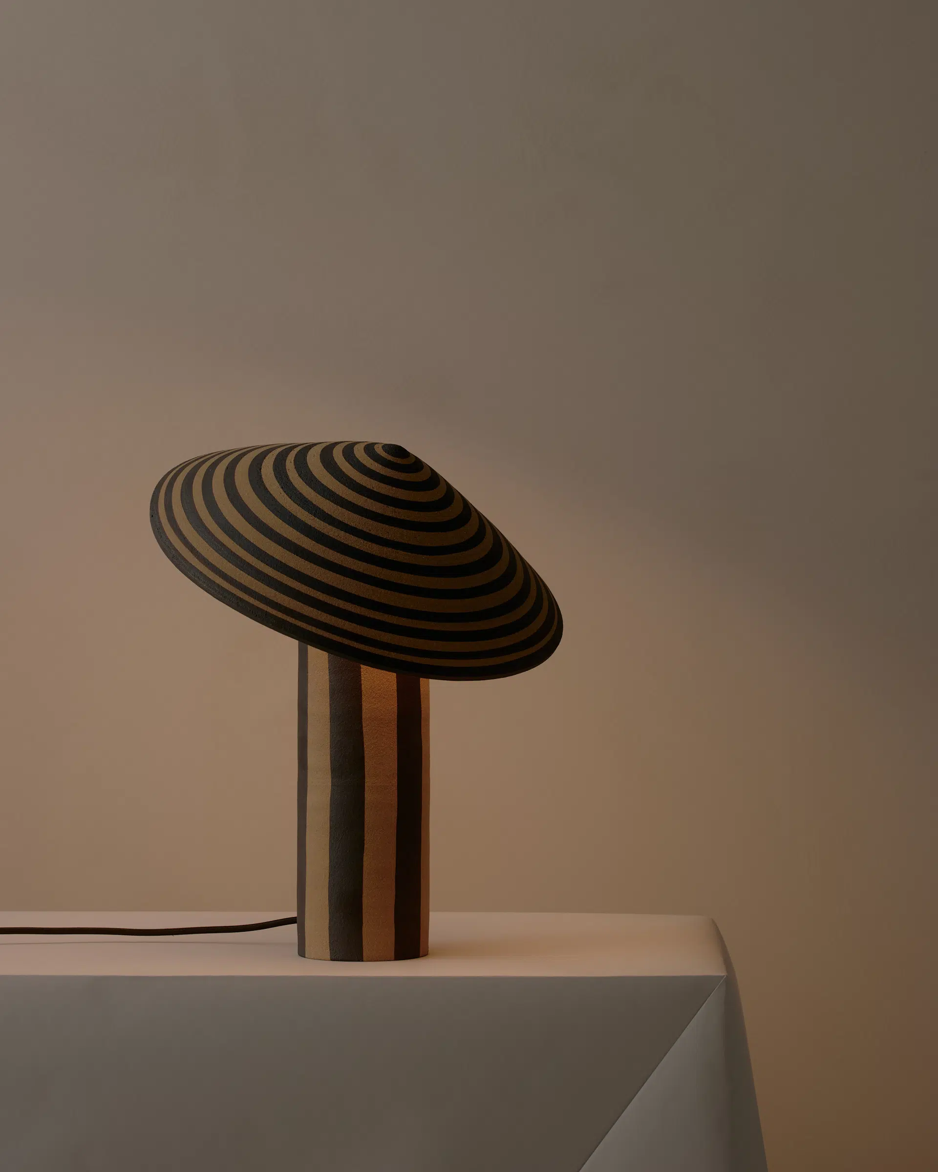 Belinda works from her studio in Preston where each piece is wheel-thrown, hand-finished, and fired. Dancer is crafted using mid-fire clay and brushed with black iron oxide, providing a striking contrast against the warm brown clay. Each lamp is offered in three striped finishes — wide, thin and spaced. Table lamps are available in any combination of these finishes.