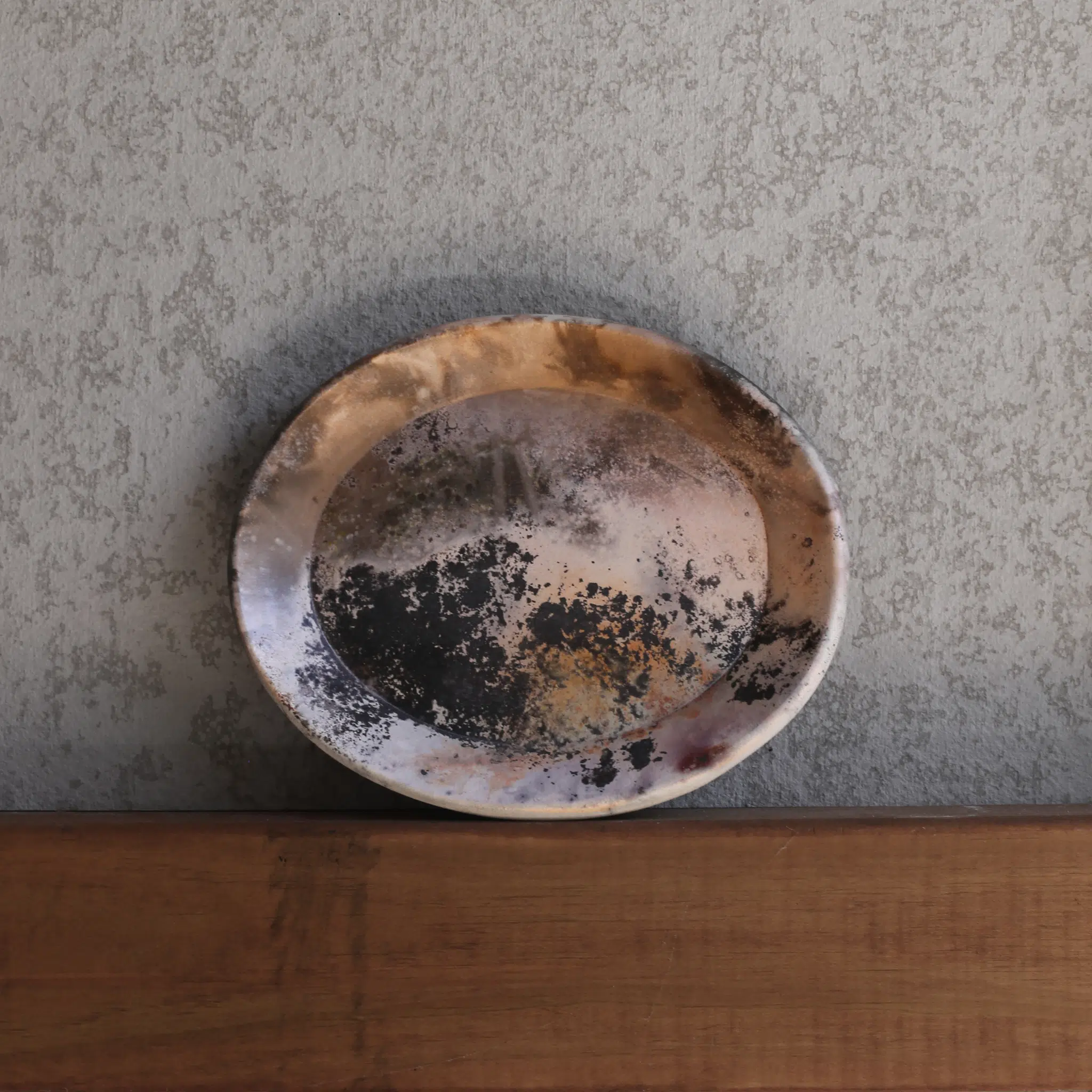 This limited series of decorative plates was made by hand in Naarm (Melbourne) by Ella Bendrups from white Raku clay. They were barrel fired on the Mornington Peninsular in Spring 2023 with salt, straw, copper carbonate, red iron oxide, walnut shells and banana peels to create unique surface pattern and texture and finished with a light coat of museum grade Renaissance Wax. Evidence of the making and firing process is visible on the surface of the object.